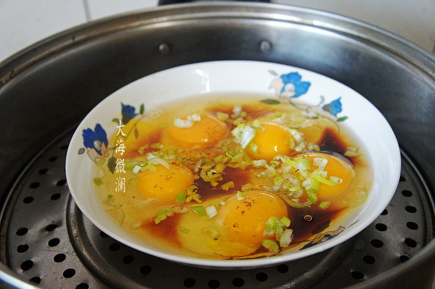 2、打入鸡蛋之前,盘底少许加点水,蒸出来的鸡蛋不粘底,加点生抽更有味道。