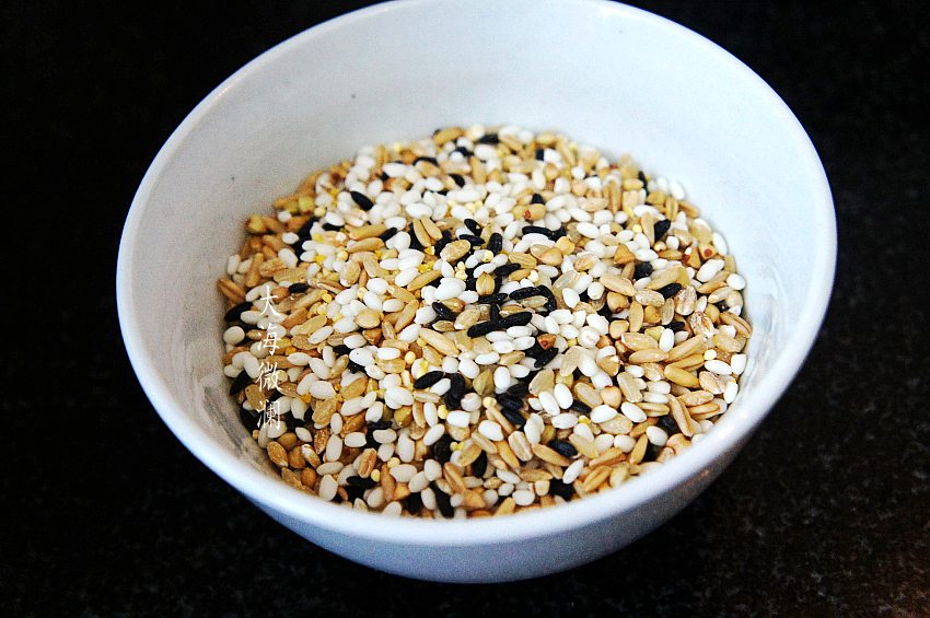 杂粮清洗干净,这是买现成的袋装杂粮,其中有糙米、糯米、黑米和高粱米。