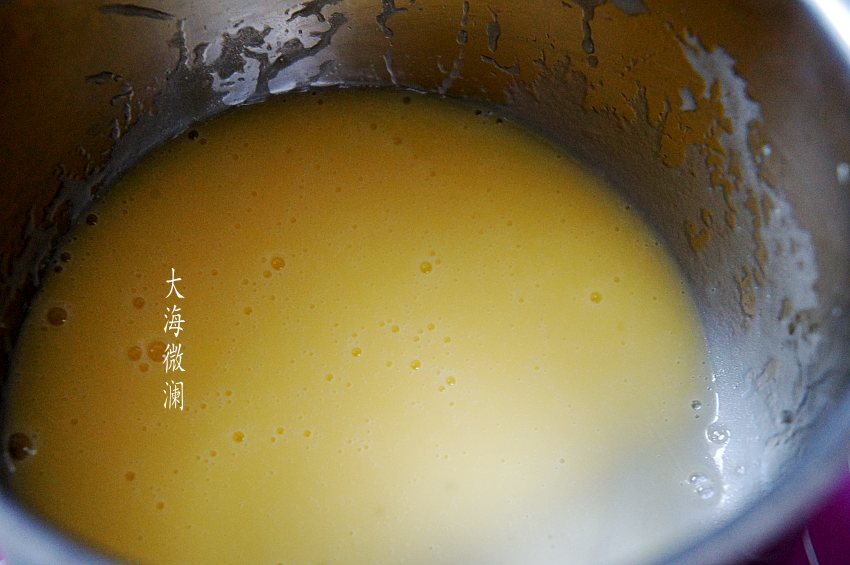 鸡蛋加入糖、色拉油、牛奶搅打均匀,充分搅拌至乳化状态。
