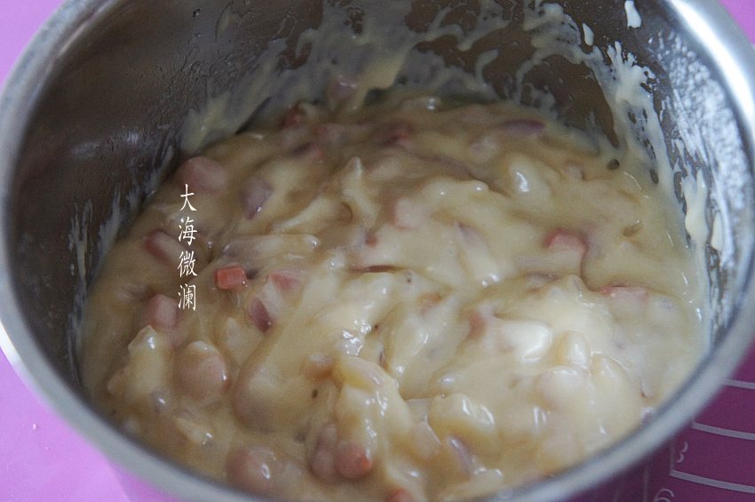 洋葱去皮洗净切丁,脆皮肠去皮洗净切丁。我选择的是咸口味,你也可以加果干做成甜口味的玛芬蛋糕。