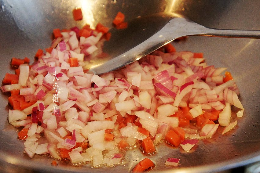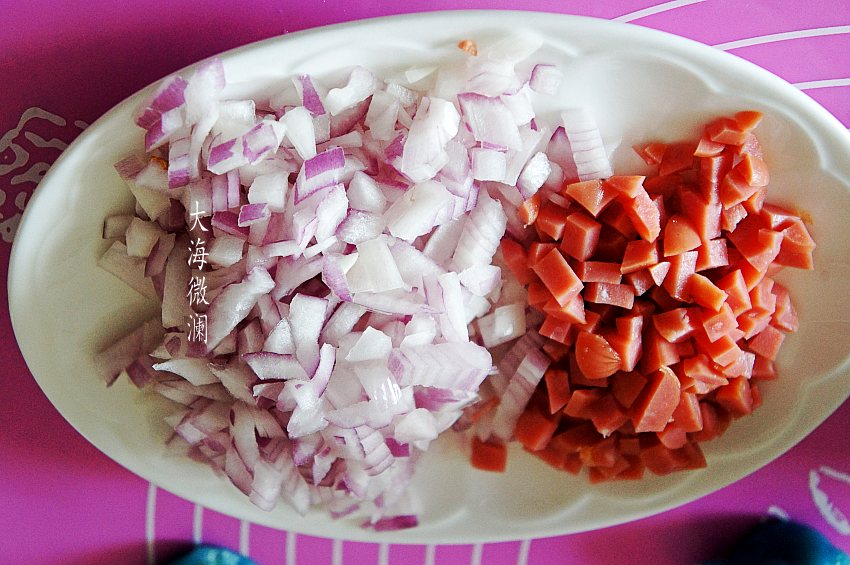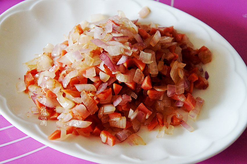 炒锅加入适量的油,爆香洋葱,加入脆皮肠丁、少许盐翻炒,炒至无水分。