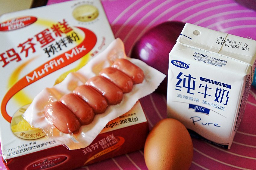 【玛芬蛋糕】所需食材:玛芬蛋糕预拌粉100g;鸡蛋1个;白糖14g;牛奶20g;色拉油40g;洋葱100g,脆皮肠1连;油适量;盐适量。