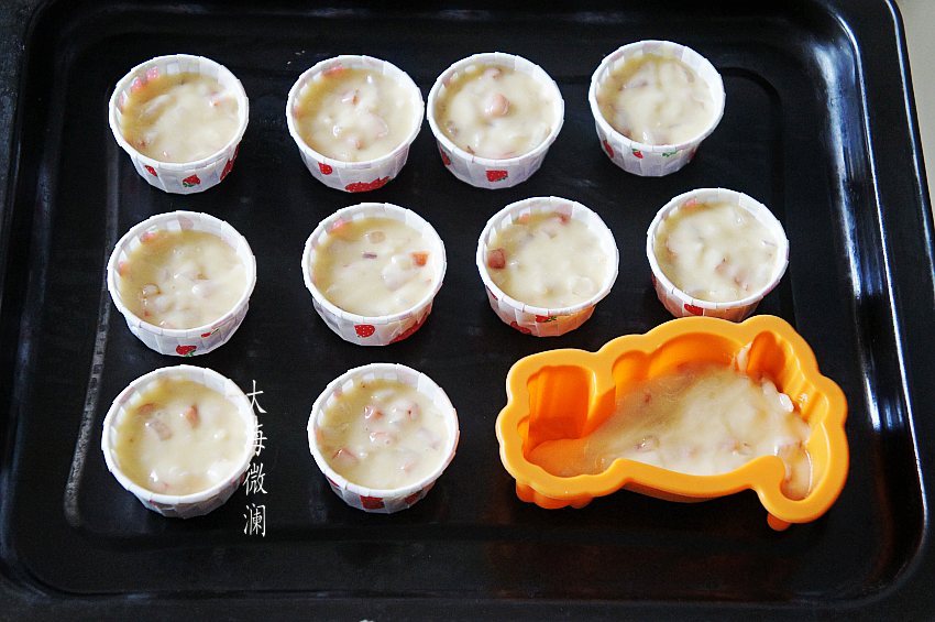 倒入纸杯,七成满,这是买预拌粉直接带的纸杯,只有十个杯子,剩下的倒入模具。