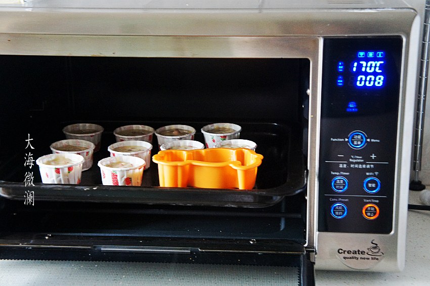 烤箱预热170度,上下火中层烤20分钟左右,烤箱品牌不同,杯子大小不同,烘烤的温度和时间也不同,请根据自己的烤箱及实际情况设置。没有烤箱可以直接倒入电饭煲蒸熟。