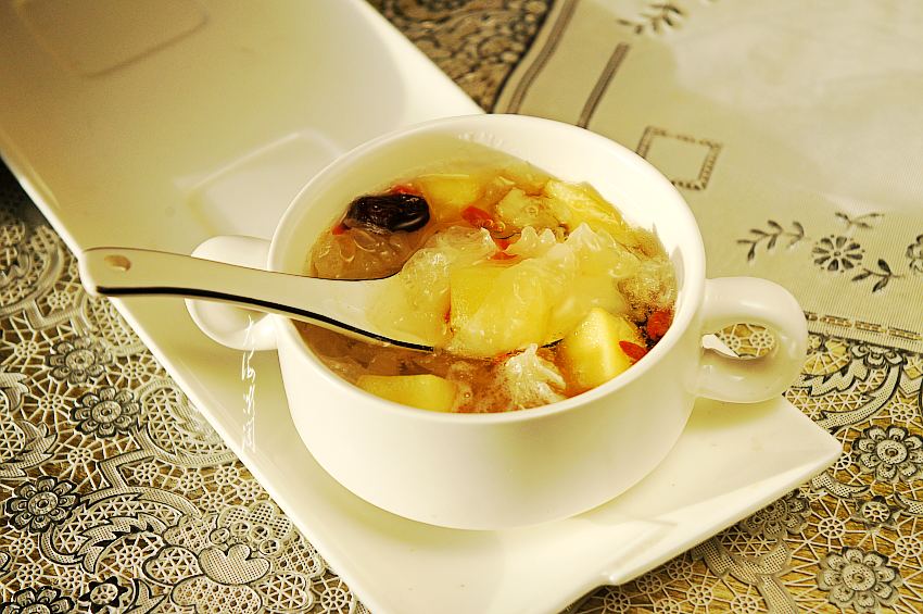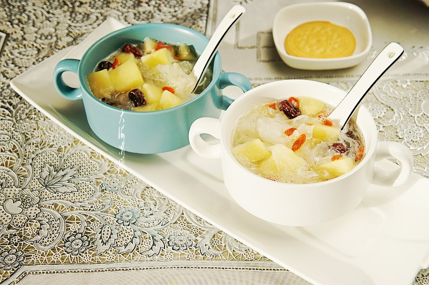 这汤加上几颗红枣营养更加丰富,银耳有“菌中之冠”的美称,是一味滋补佳品,特点是滋润而不腻滞,有补脾益气和胃、养阴润燥的作用,是可以长期食用的润肤良品。苹果则有生津止渴、润肺除烦、健脾益胃、养心益气等作用,常食苹果还能增加血色素,使皮肤变得细白红嫩,苹果酸能促使积存于人体内的脂肪分解,有减肥的效果。苹果特有的香味可以缓解压力过大造成的不良情绪,还有提神醒脑的功效,所以苹果被誉为“养心开郁佳果”。银耳中富含胶质,可以润泽肌肤,袪除面部色斑。红枣具有健脾益胃,补气、养血、安神等功效,还可以增强人体免疫力。用苹果、红枣和银耳一起煲汤,不仅营养丰富,味道甜美,还能润肤养颜,补血安神。再加上枸杞子,还有养肝明目的作用。