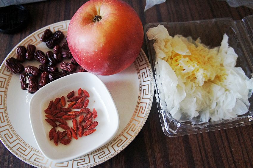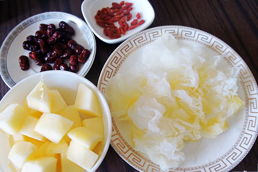 【银耳苹果汤】所需食材:苹果1个;银耳(鲜)半朵;红枣适量;枸杞子适量。