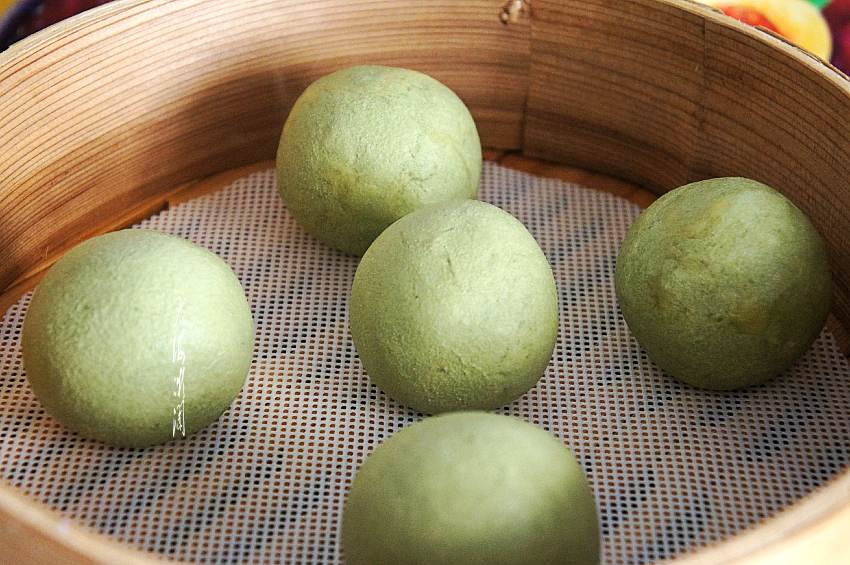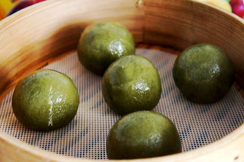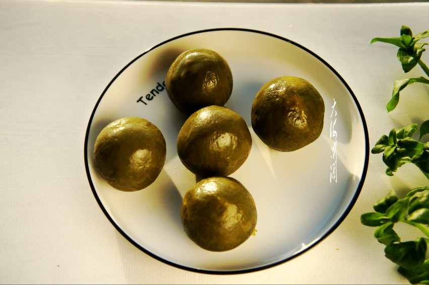 蒸出来的青团一点也没塌陷,颜色还是挺漂亮的,也很绿。放到阳光下颜色变成暖色调了,当时还没注意,吃完才发现木有了。