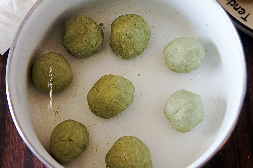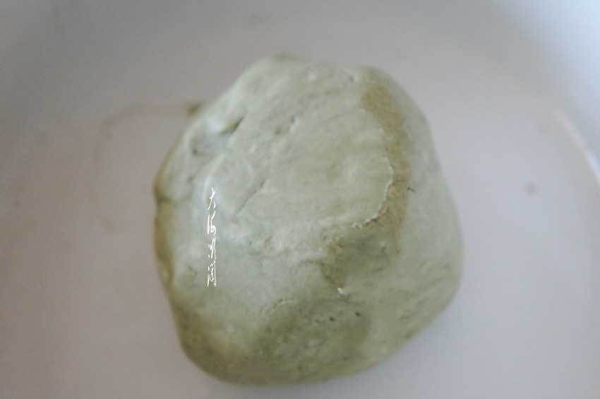 包这个青团可以不用案板,直接一个一个的包即可。面团也分成8份,包的时候感觉小了,后来改成5份,面团基本40g1个。