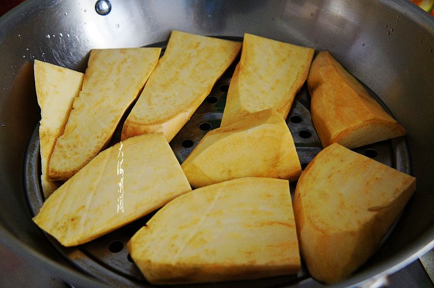 原本想煮红豆沙馅,发现家里有一个大红薯,用来做馅更简单了,估计得有2斤重,去皮洗净切片,锅中加入适量的水,上屉蒸熟。