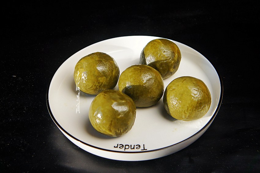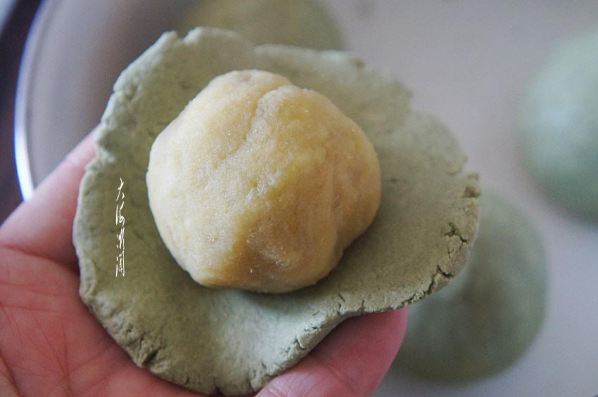 这道特别的青团我用的是粘米粉和青菜汁粉和面,用红薯做馅料