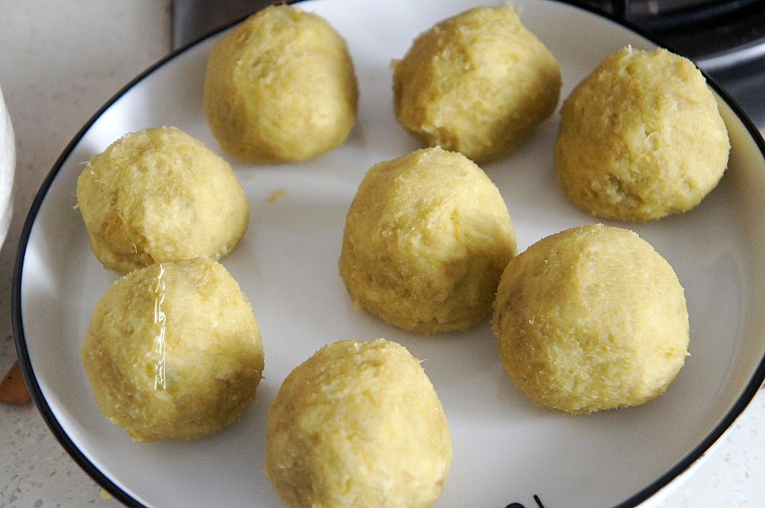 晾凉的红薯泥,视干稀程度可以适量加点玉米淀粉,我没加,感觉这红薯泥还挺干的,攥成馅团。红薯的品种不同,干稀也不同。