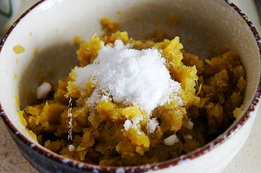 蒸熟的红薯趁热压成红薯泥,加入适量的白糖拌匀,冷却。