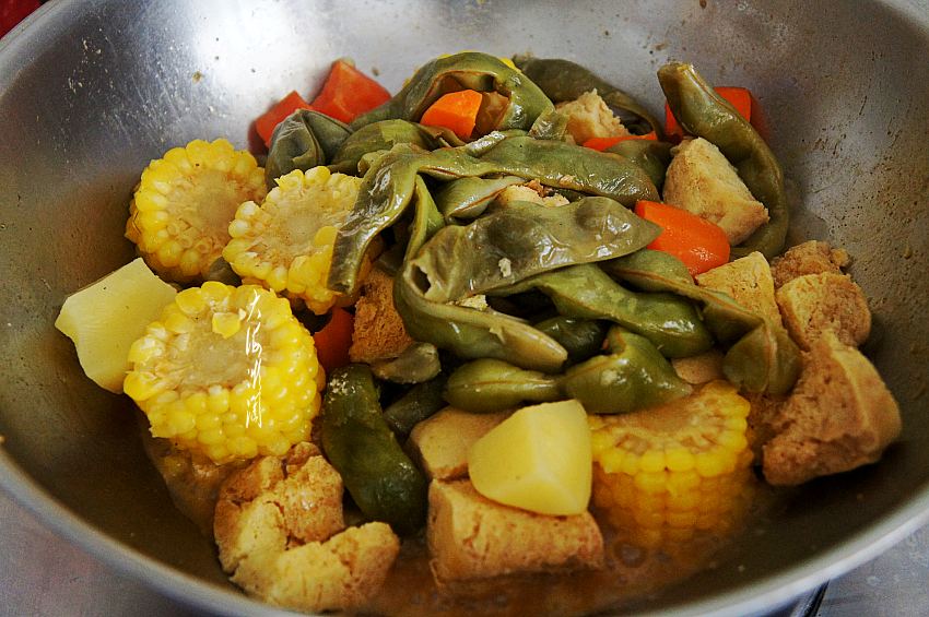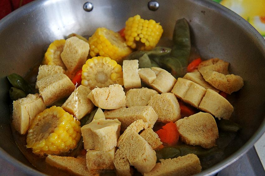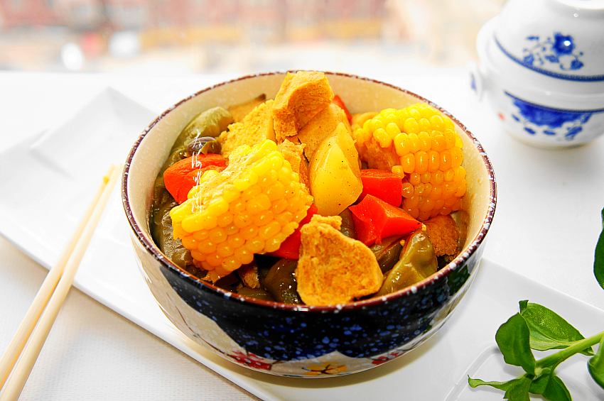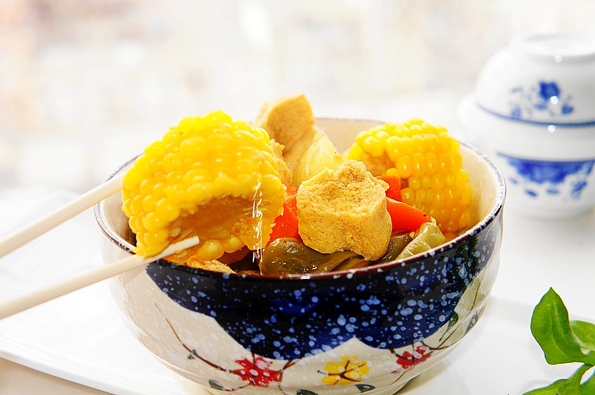 加入玉米和冻豆腐,感觉水少还可以再少加点。今天的乱炖加了冻豆腐特别好吃,口感滑嫩,咬一口汤汁直流,全家人抢着吃。