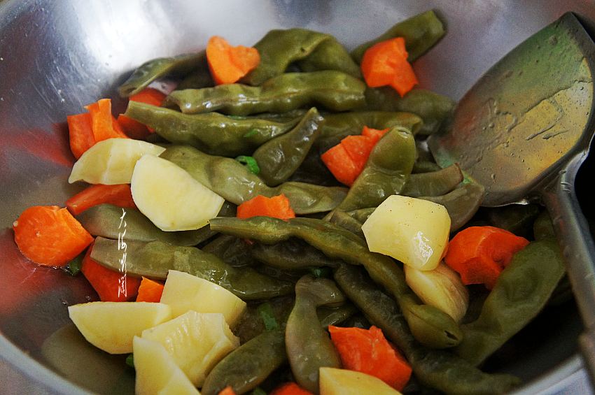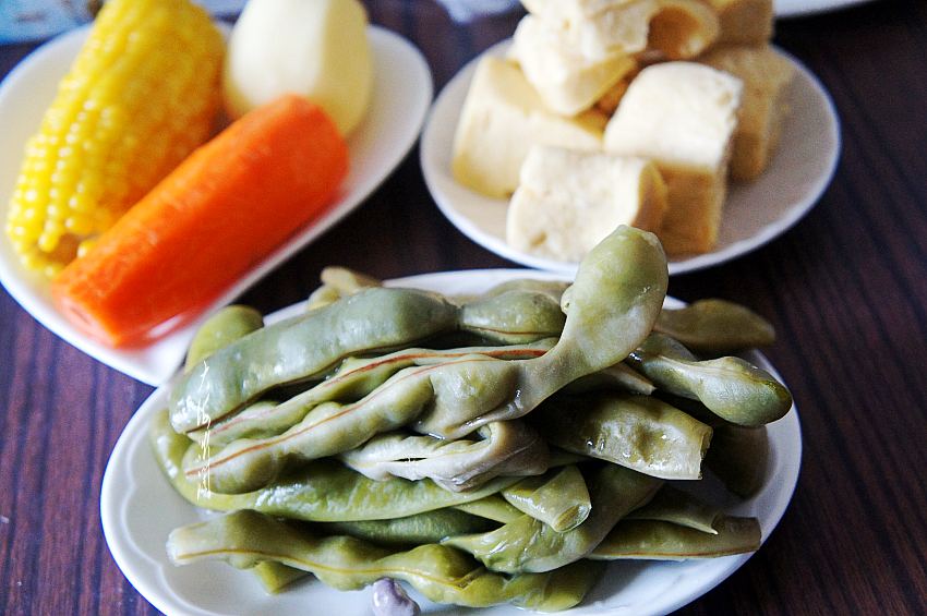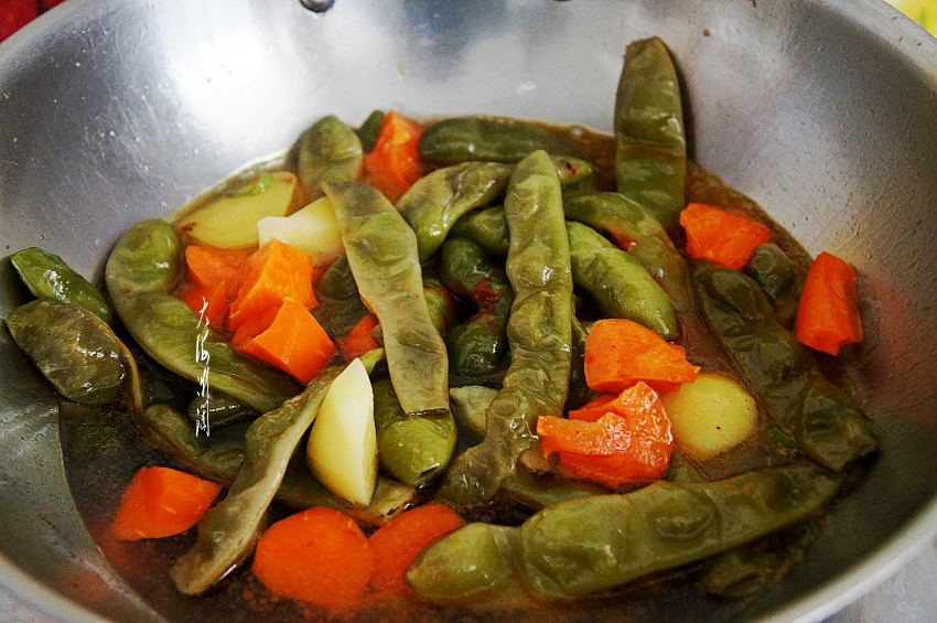 解冻后的玉米、豆角和冻豆腐都过冷水洗净,豆角和冻豆腐都攥掉水分,嫩玉米切段儿,胡萝卜切滚动块,土豆切滚刀块。