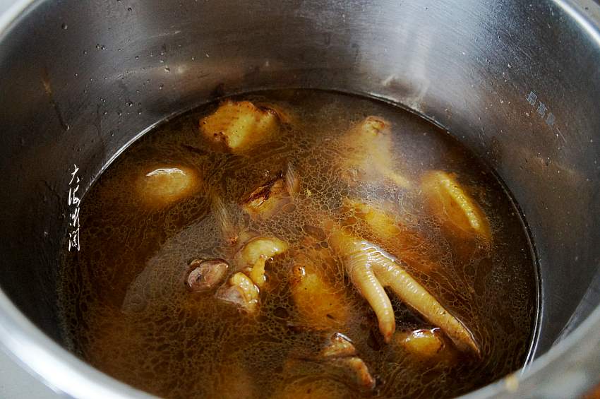 然后加入适量多的水,老母鸡要多加一些水,为了加快速度,换成压力锅炖鸡,大火烧开,小火炖半小左右。