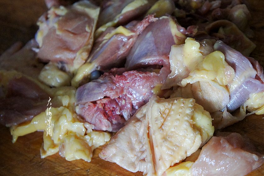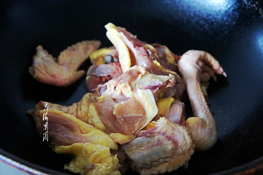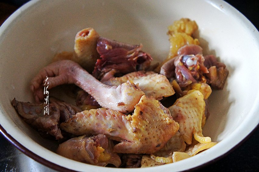 半只小笨鸡冷水浸泡出血水,然后根据自己喜欢的大小斩成块,清洗干净,控净水分。这是自家养的一只老母鸡,肉很肥,实际上不到半只鸡,鸡胸肉被剔出去了。