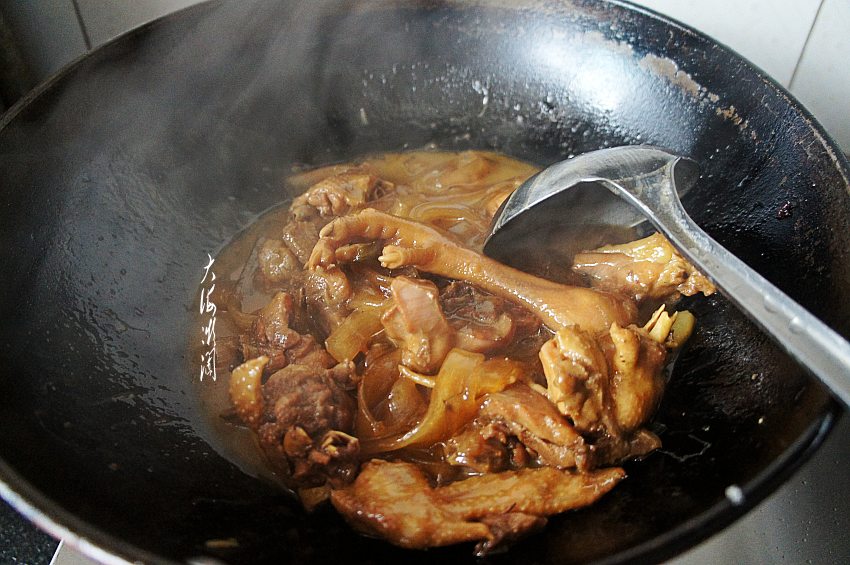 炒锅加热,下入控净水分的鸡块,中小火翻炒,炒至鸡块无水分为止。记住千万别焯水,这是炖鸡好吃的窍门之一。很多人喜欢先焯水再炖,焯水后的鸡肉没有炒出来的鸡肉紧实,口感也不好,这两种做法我都试过,炒后再炖的鸡肉特别香。我老娘一辈子都是这么炖,亲朋好友左邻右舍都赞赏有加。