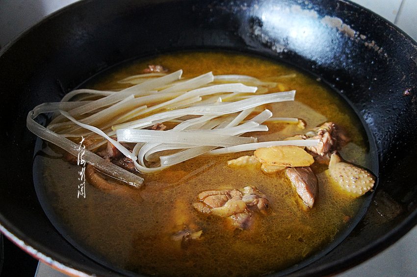 压力锅解压后,倒入炒锅中,此时鸡肉炖得还不是很烂,加入洗干净的宽粉条,大火烧开,小火炖至鸡肉、粉条熟即可。东北吃的都是土豆粉条,特别白,劲道滑爽,南方人可能不喜欢,可以换成红薯粉或者绿豆粉条。当然地道的东北菜,还是土豆粉条最好吃。