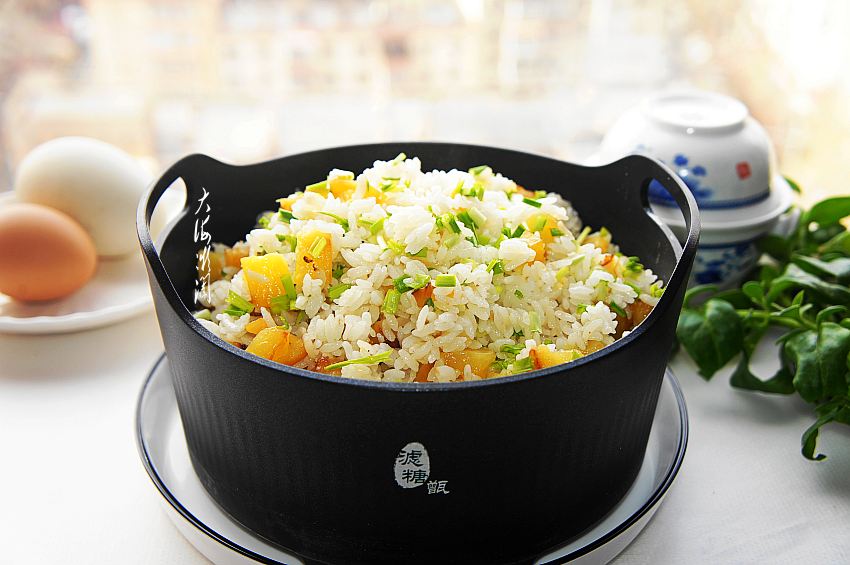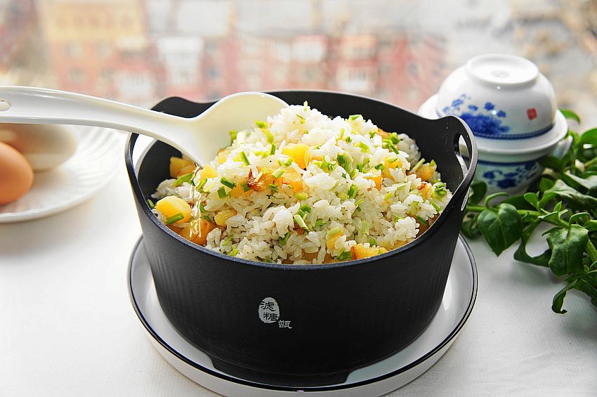 最后撒上点蒜苗碎,用铲子或者筷子松动一下米饭,粒粒晶莹,不但看着有食欲,味道更好吃,有咸淡口味,淡淡的胡椒香味,真是好吃到停不下来。不怕胖的朋友,底下还有米汤盒子,那米汤也是非常好喝的,糖尿病人就不要品尝了。