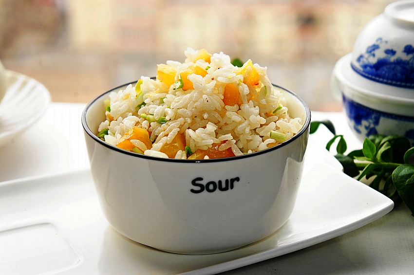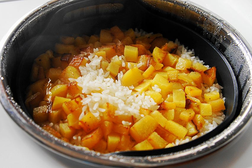 出锅备用,大米加入适量的水淘洗干净,滤糖甑底部放好甑底垫,然后将淘洗干净的米放入滤糖甑中。如果想减肥的朋友还担心有油脂,油炒这一步也可以省了,直接将土豆丁和大米放到一起蒸就好了。
