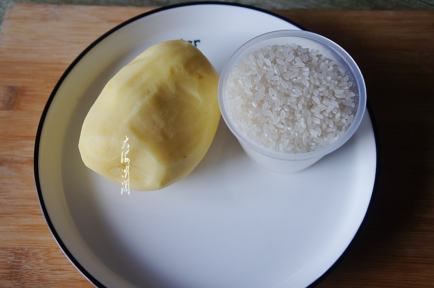 一个大土豆,去皮洗净,大米这么两盒是300g,一家人吃刚刚好。