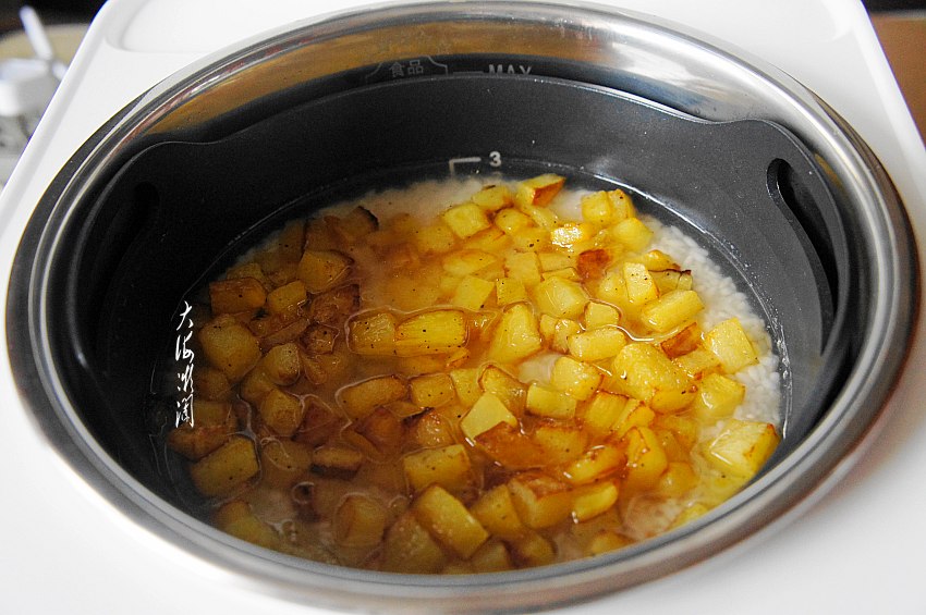 然后将滤糖甑放入臻米脱糖蒸汽养生煲的内胆中,加入适量的水,水位到2的位置,最后倒入炒好的土豆丁。