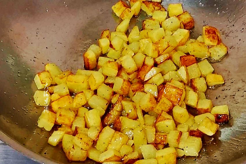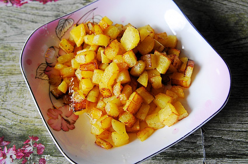 锅中加入适量的油,下入土豆丁翻炒,炒至土豆金黄,加入盐和适量的胡椒粉调味。
