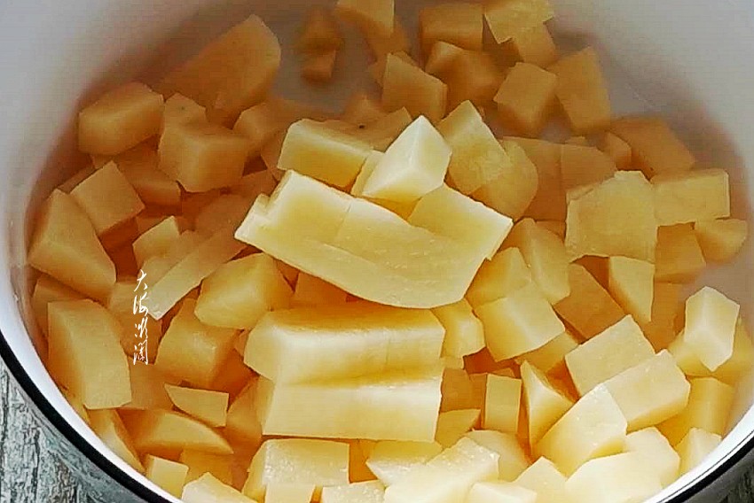 土豆切丁,加入适量的水,浸泡5分钟左右,去掉淀粉,捞出控净水分或者用厨房纸擦干水分,避免炒的时候嘣油。土豆丁的大小随自己喜欢,也可以是大的滚刀块。