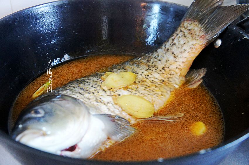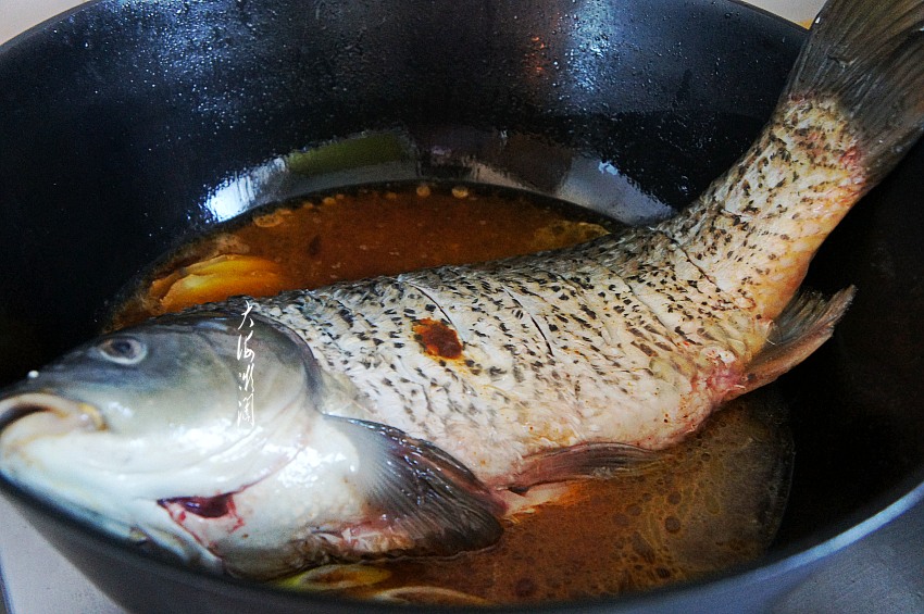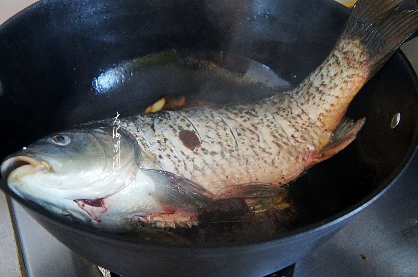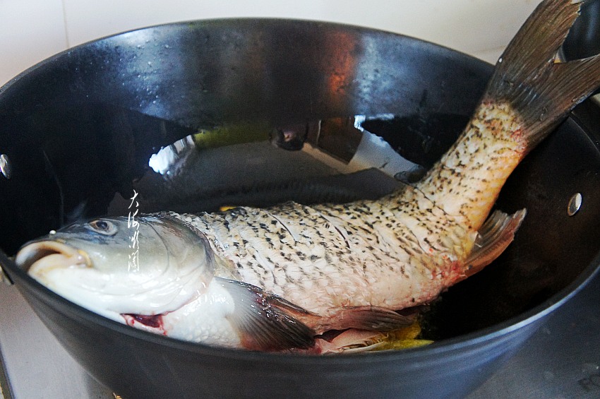 下入鲤鱼小火煎,不用翻面煎,鱼太大,也不好翻面。