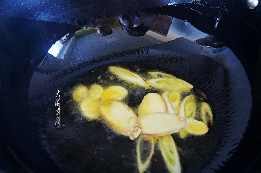 葱去皮洗净斜切段儿,姜去皮洗净切片,炒锅加入适量的油,爆香葱姜。
