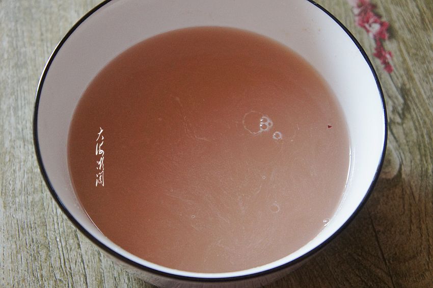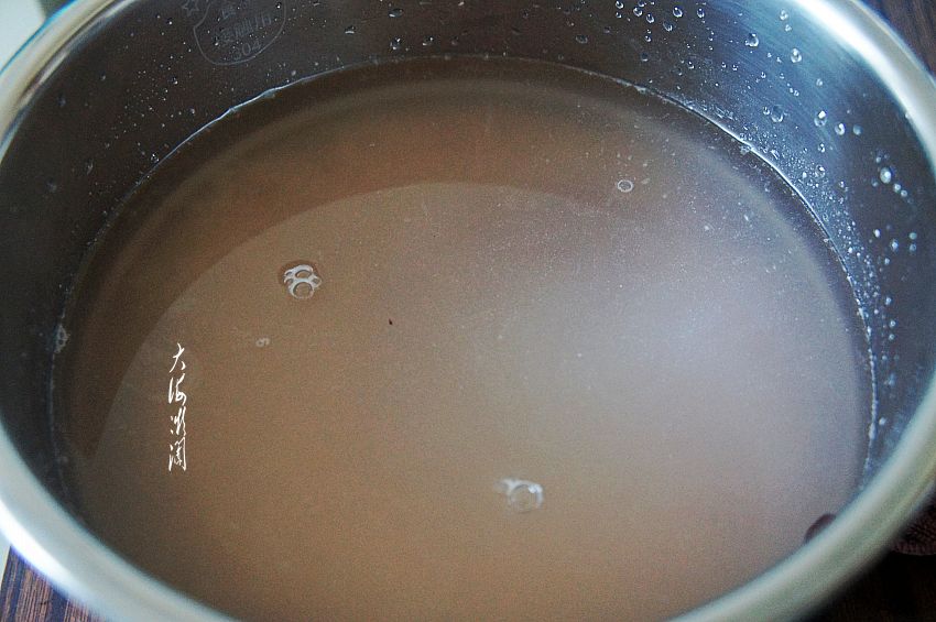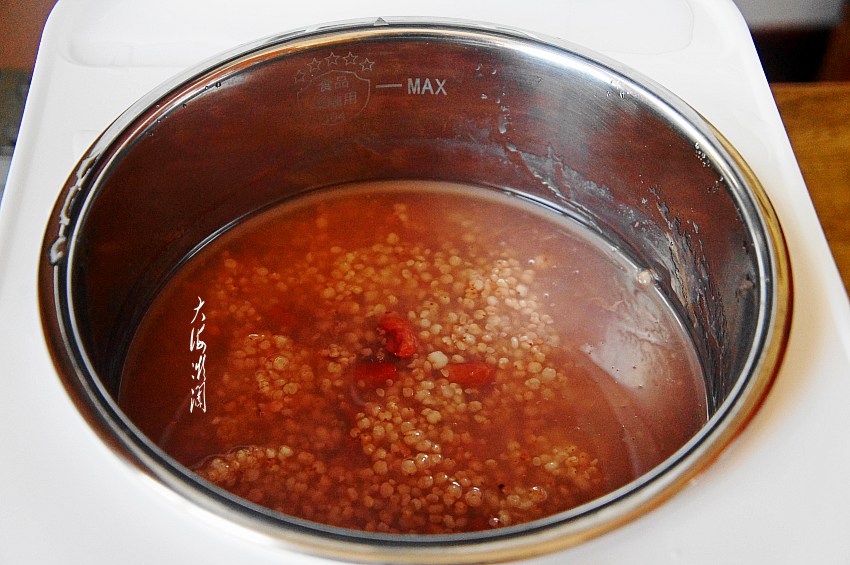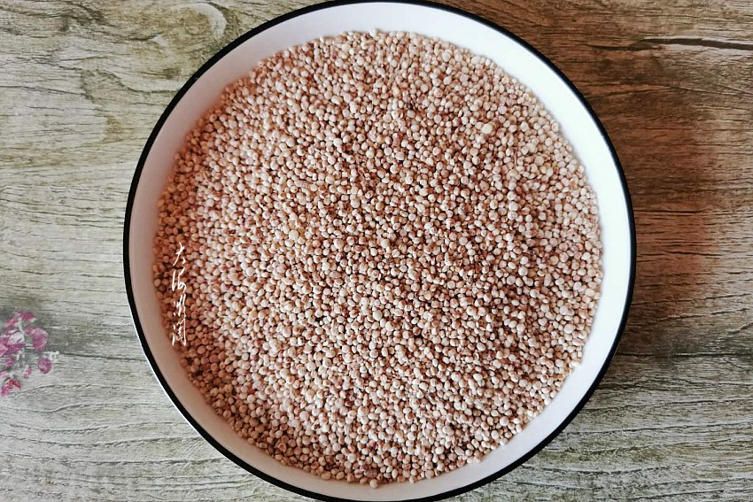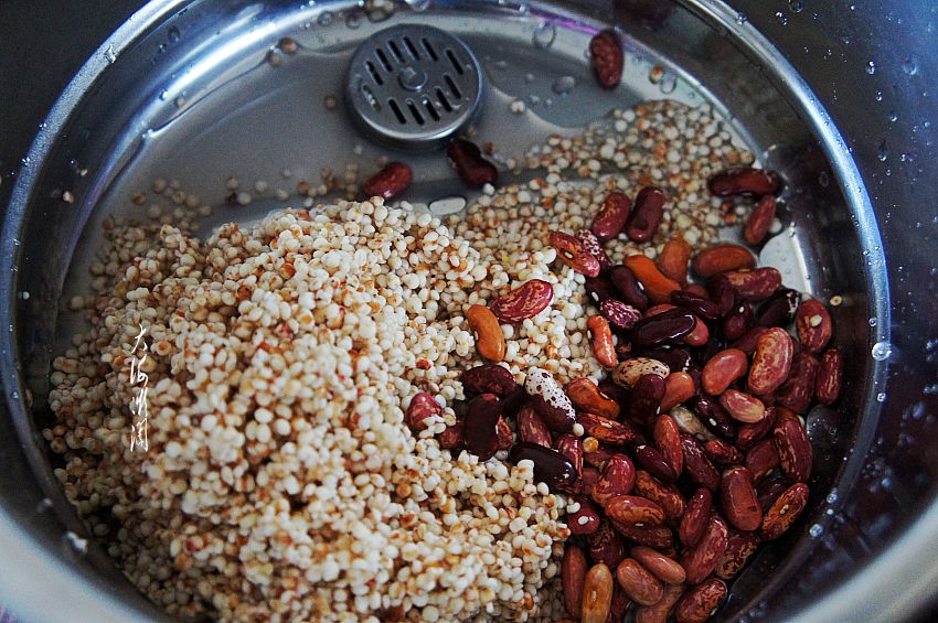 高粱米淘洗干净,可以多淘洗几遍,上面的颜色就慢慢变淡了。
