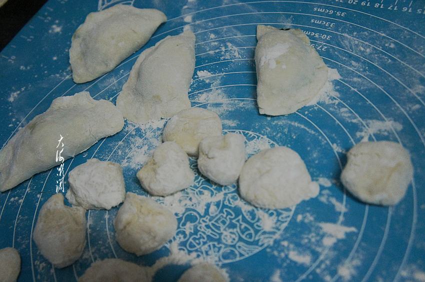 饧好的面团揉成长条,均匀的切成若干个面剂子,是平常包饺子的两倍大就好。擀成饺子皮,包大馅饺子,皮薄馅大才好吃,包饺子还不容易破。