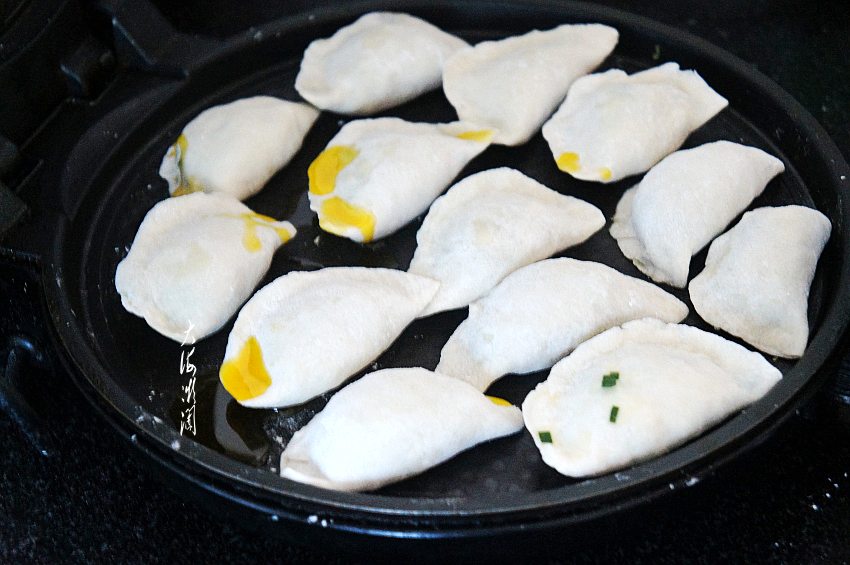电饼铛刷底油,码入包好的大饺子,上边也可以刷油,然后盖上上盖,上下火中温慢慢地煎。