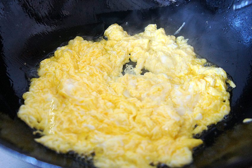 鸡蛋打散,少许兑点水搅拌均匀。炒锅加入适量多一点的油,拌馅时不用另加油了。油开倒入蛋液,迅速用筷子搅拌,越碎越好,然后取出备用。
