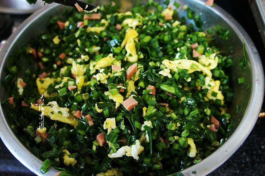 2、韭菜切碎后,一定要拌点色拉油锁住水分,再拌馅时加盐才不会出水。