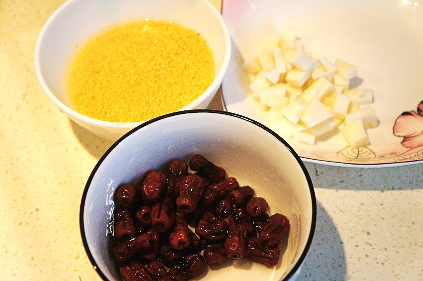 山药切小丁,小米淘洗干净,浸泡好的金丝枣反复洗净。春天是各种慢性病复发的季节,经常吃点枣可以提高人体的免疫力,煮粥入菜零食都是不错的选择。