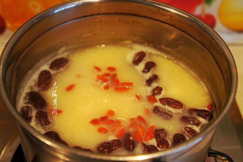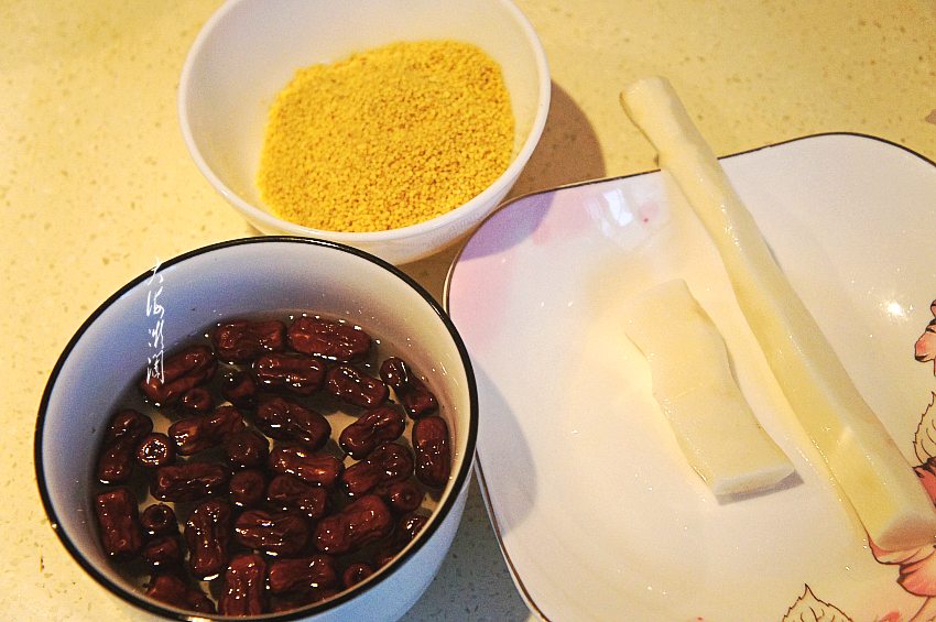 【红枣枸杞小米粥】所需食材:小米1大勺;枸杞子1把;金丝枣适量;山药数量。