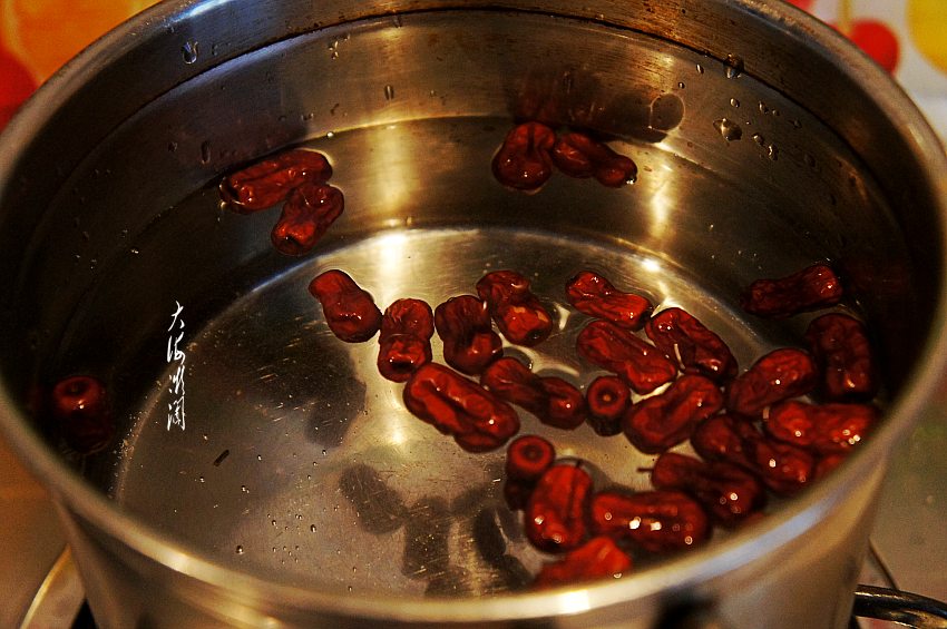 锅中加入适量的水,要多加一点,中途不能加水,同时放进金丝枣,大火烧开。