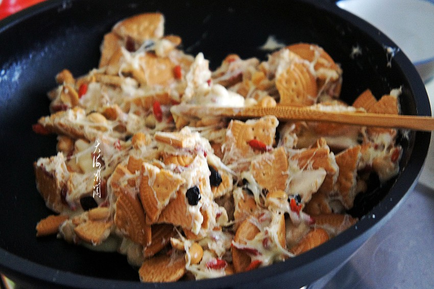 关火,加入奶粉继续翻炒至奶粉完全融合。然后把准备好的饼干,坚果,果干混合物一起倒进去,快速翻炒均匀。