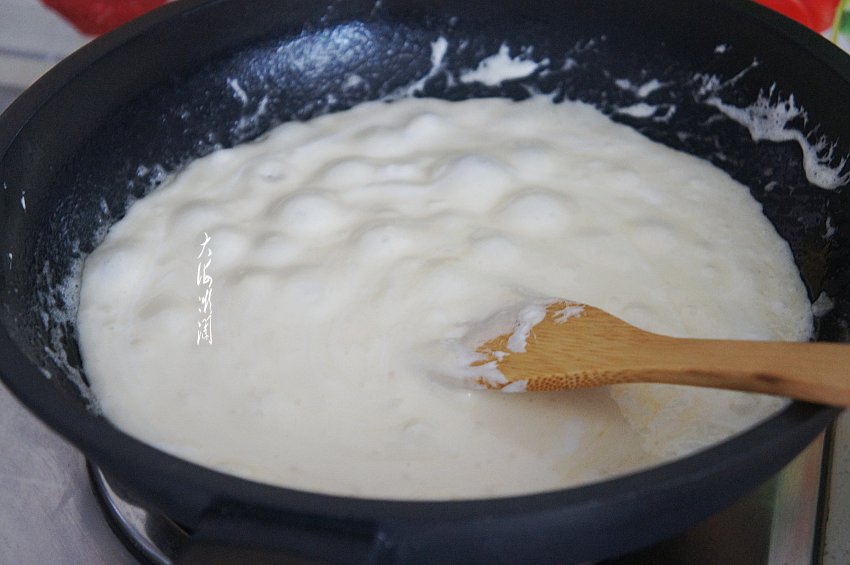 不停地搅拌至棉花糖完全融化,马上关火倒入奶粉;如果你喜欢硬一点的口感,那么棉花糖完全融化后,再炒一会儿再关火,搅拌均匀。