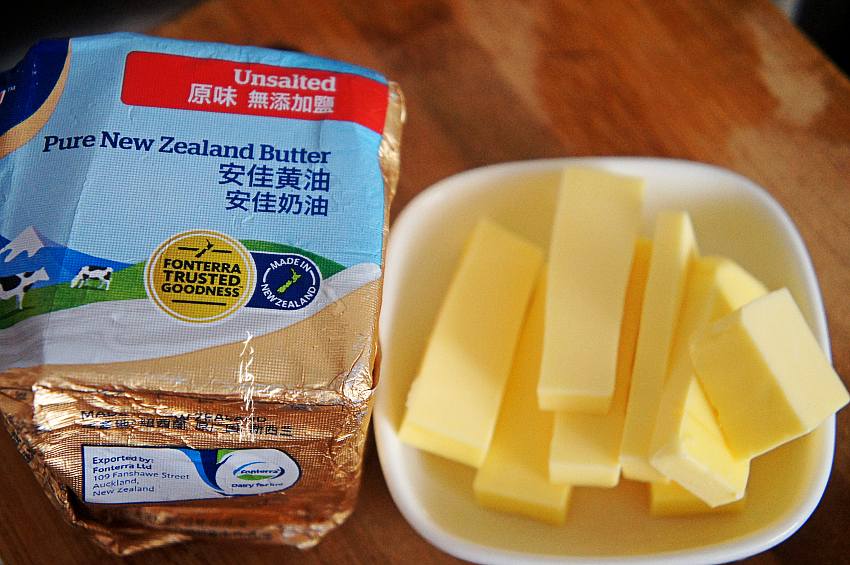 冷冻的黄油取出暖化至软,能切动就好,切块备用。