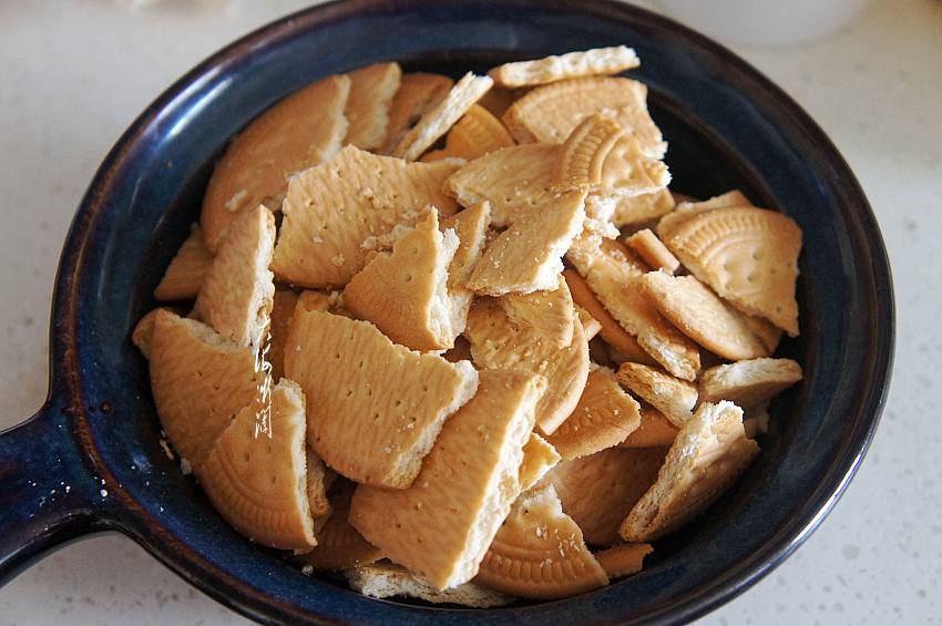 准备好的饼干先掰成小块,不用掰得太碎。所有食材一定要提前都称重准备好,因为后面开始操作之后,就不能离开锅前,要不停搅拌,否则容易糊锅。