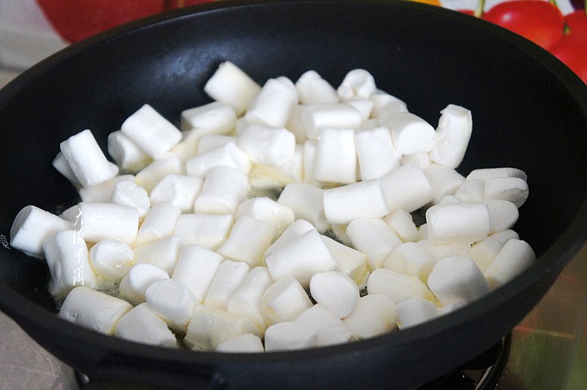 不粘锅烧热,记得一定要用不粘锅。放入黄油融化,小火慢慢搅拌黄油直到完全融化,倒入棉花糖,依然小火,不停的搅拌。