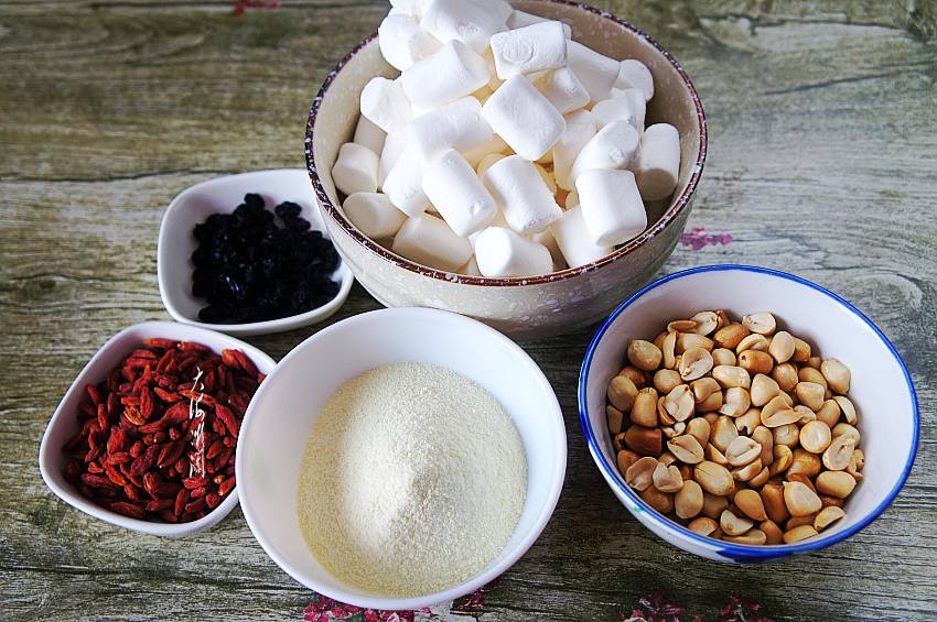 准备食材:花生米提前放入空气炸锅烤熟,然后去皮。可以搭配混合坚果,自己调整。枸杞子提前清洗干净,用厨房纸擦干水分。蓝莓干提前清洗干净,用厨房纸擦干水分。所有食材都称好重量备用。大颗粒的棉花糖也可以剪成小块再用,融化得更快。