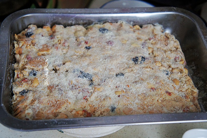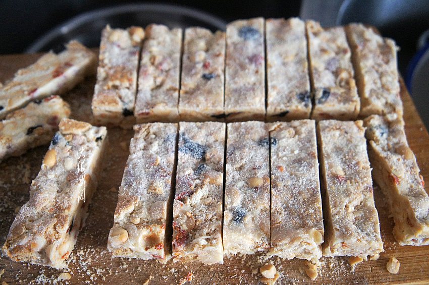 放至温凉后,切成你想要的大小即可。可以把每一个小块的切面也随意粘上一点奶粉,会更好看。