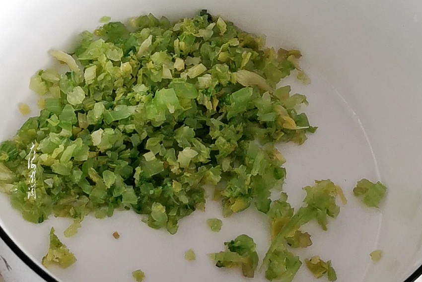 买一棵西芹,只有芹菜心还有一点芹菜叶,太少,适合搭配蔬菜饼。芹菜叶在淡盐水中浸泡10分钟,然后反复清洗干净,锅中加入适量的水,水开加一勺盐,下入芹菜叶焯烫一下,变色立即捞出,过冷水后捞出,控净水分。