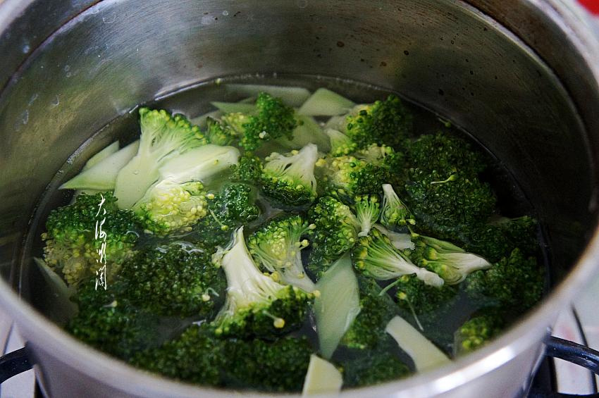 西兰花在淡盐水中浸泡10分钟以上,半小时左右均可。尽量的将其上面附着的尘土等清洗干净,淡盐水也能起到杀虫的作用,然后反复清洗捞出。锅中加入适量的水,水开加一勺盐,滴几滴油。下入洗干净的西兰花焯水,颜色变绿立刻捞出过冷水,控净水分。加盐和油可以保持西兰花颜色更鲜艳。