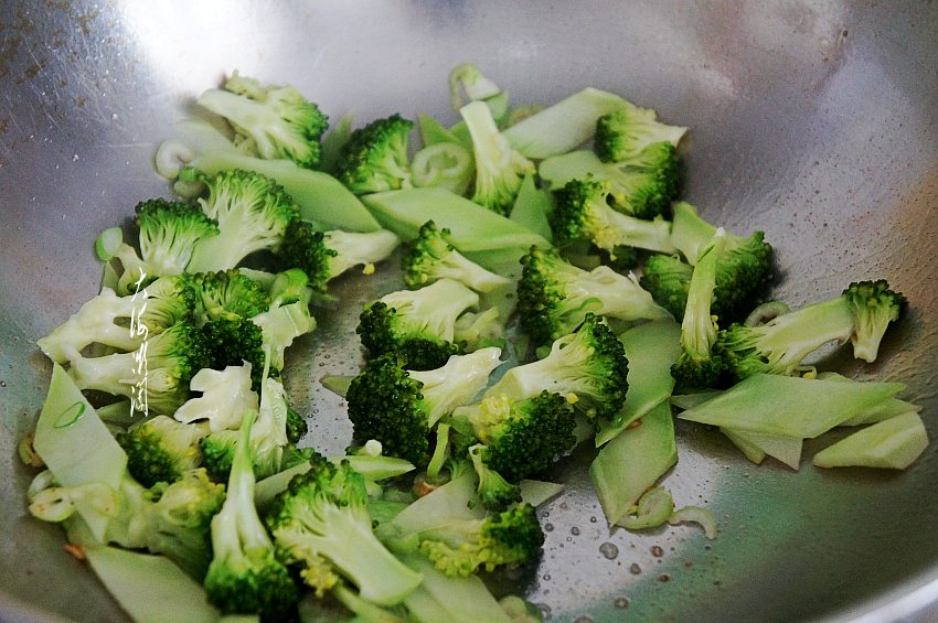 炒锅加少许油,爆香葱花、蒜碎、五香粉,加入西兰花翻炒。