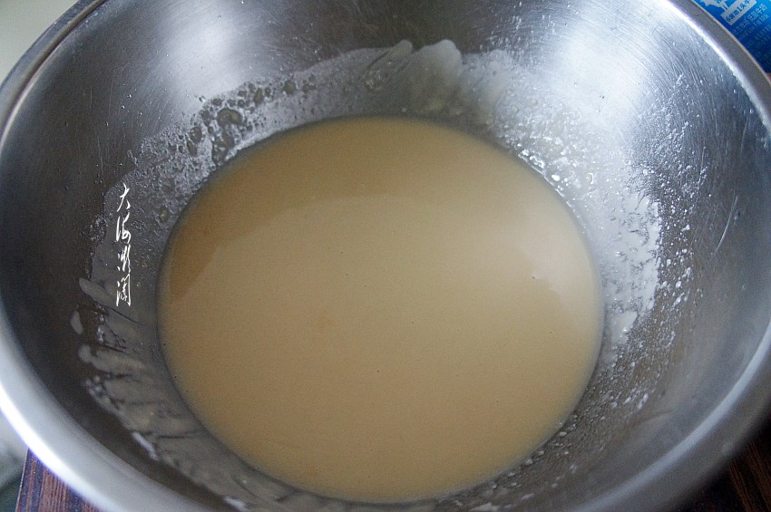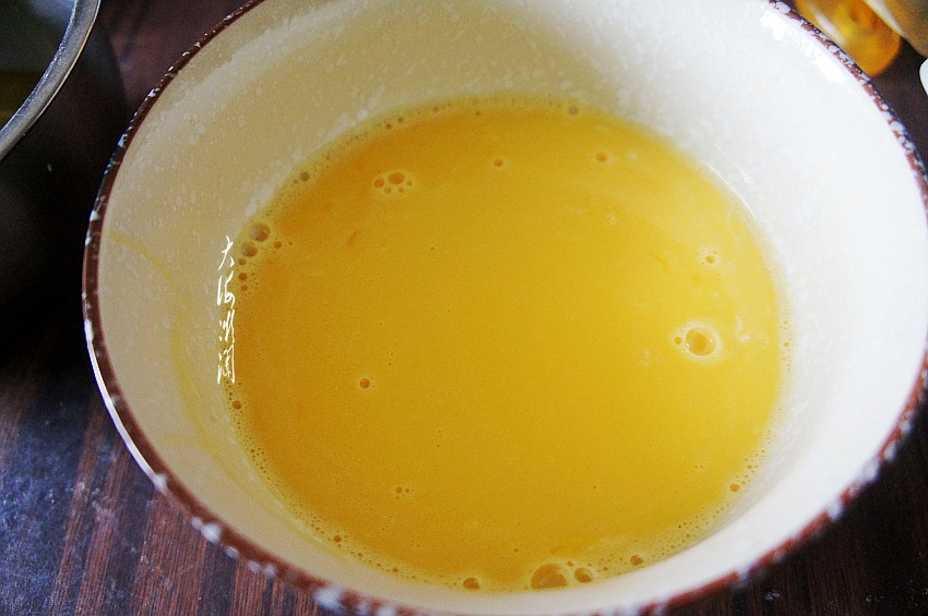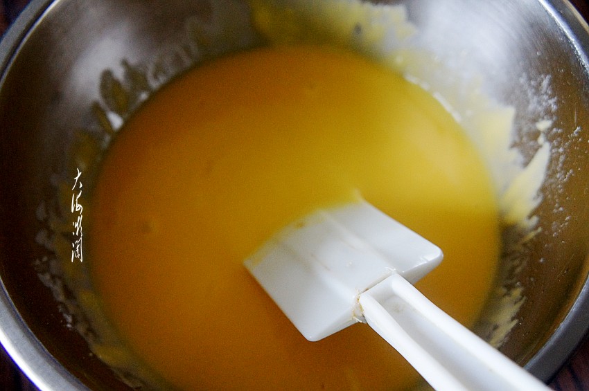 4个蛋黄加一个全蛋液充分打散,搅拌均匀,牛奶小火加热至60度,冲入蛋黄液中,边冲边搅拌均匀。
