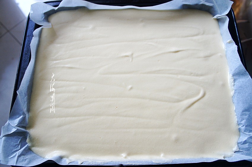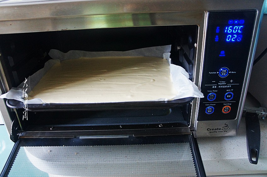 烤盘铺上油纸,调好的蛋糕糊倒入烤盘,轻震两下,用牙签在蛋糕糊中来回划几下,去除大气泡。